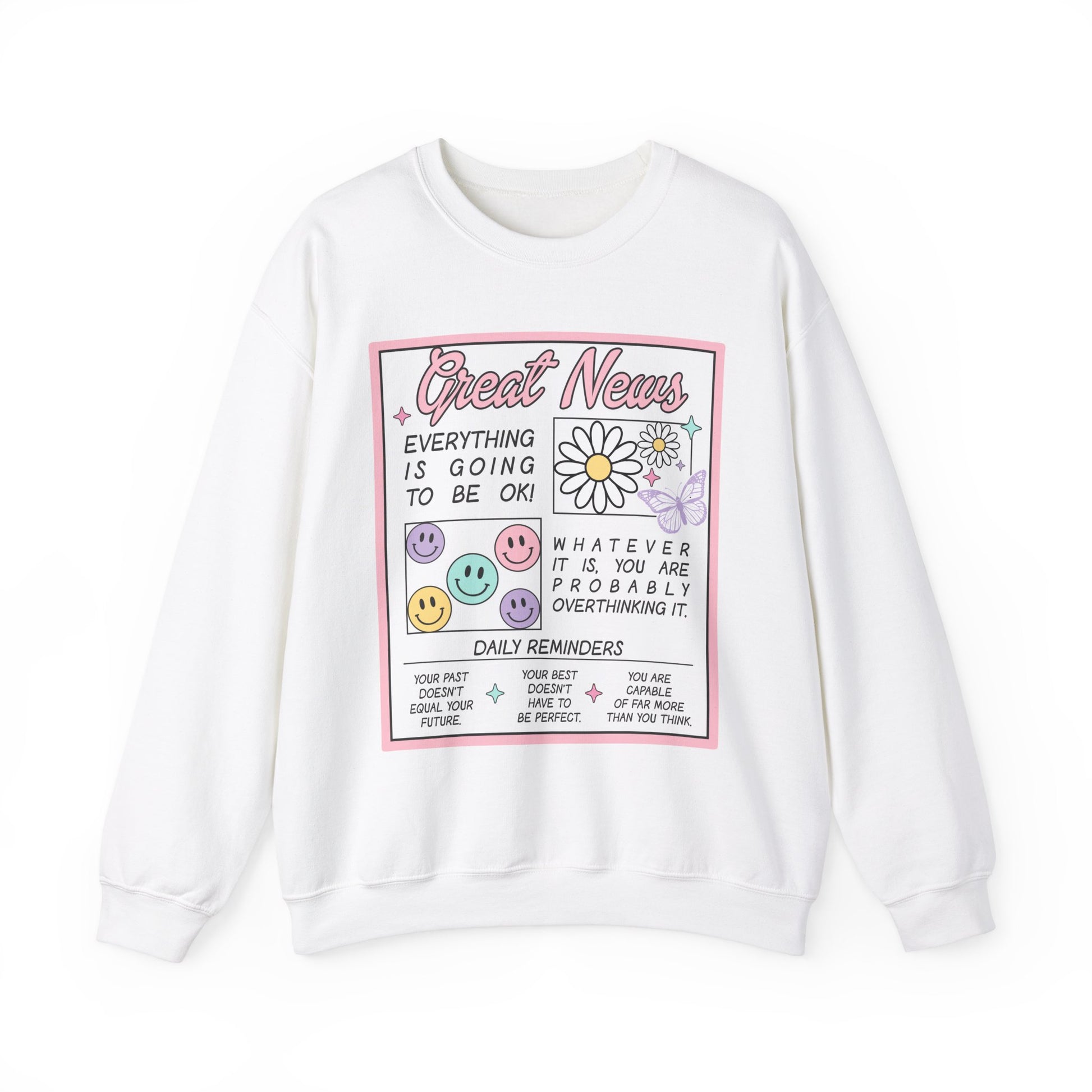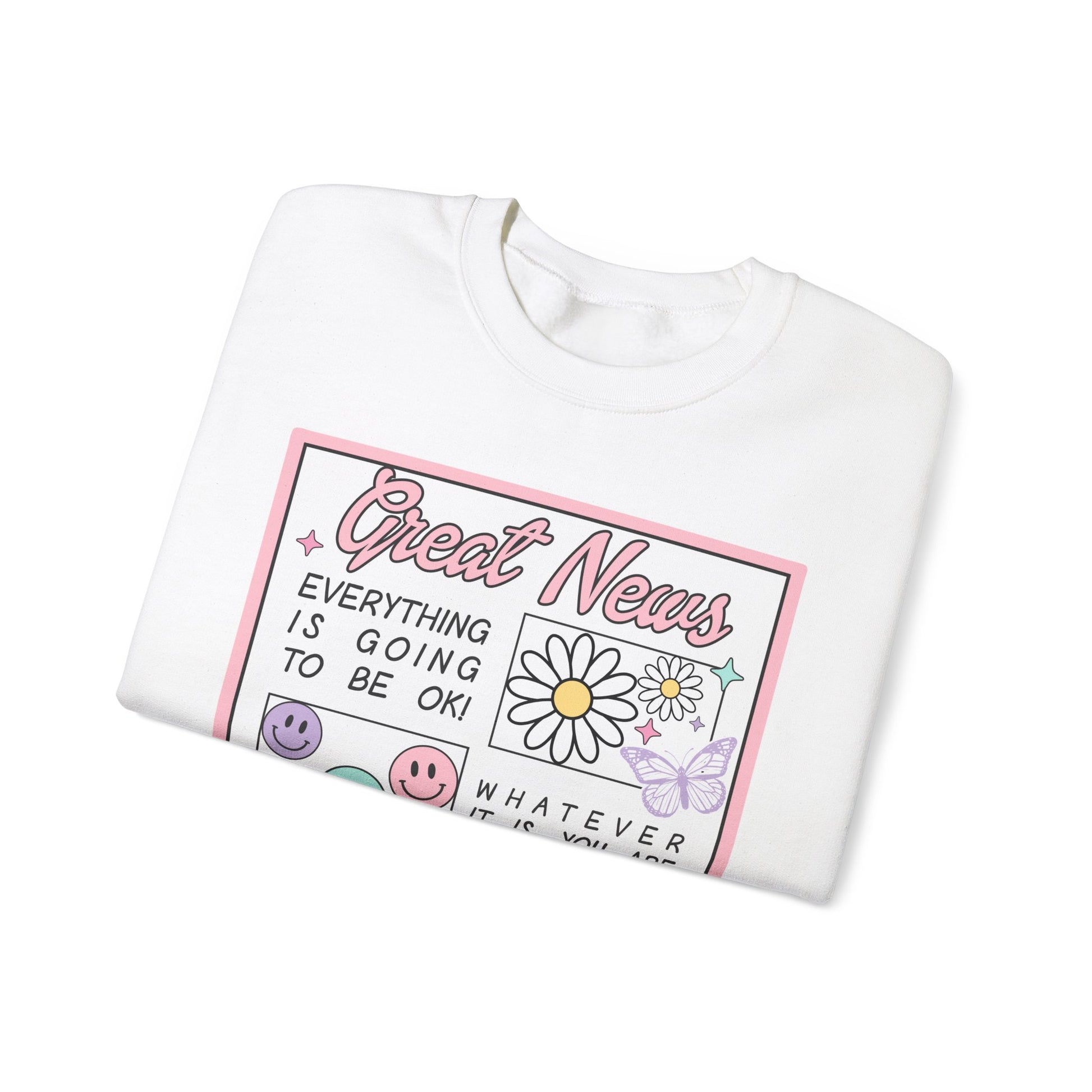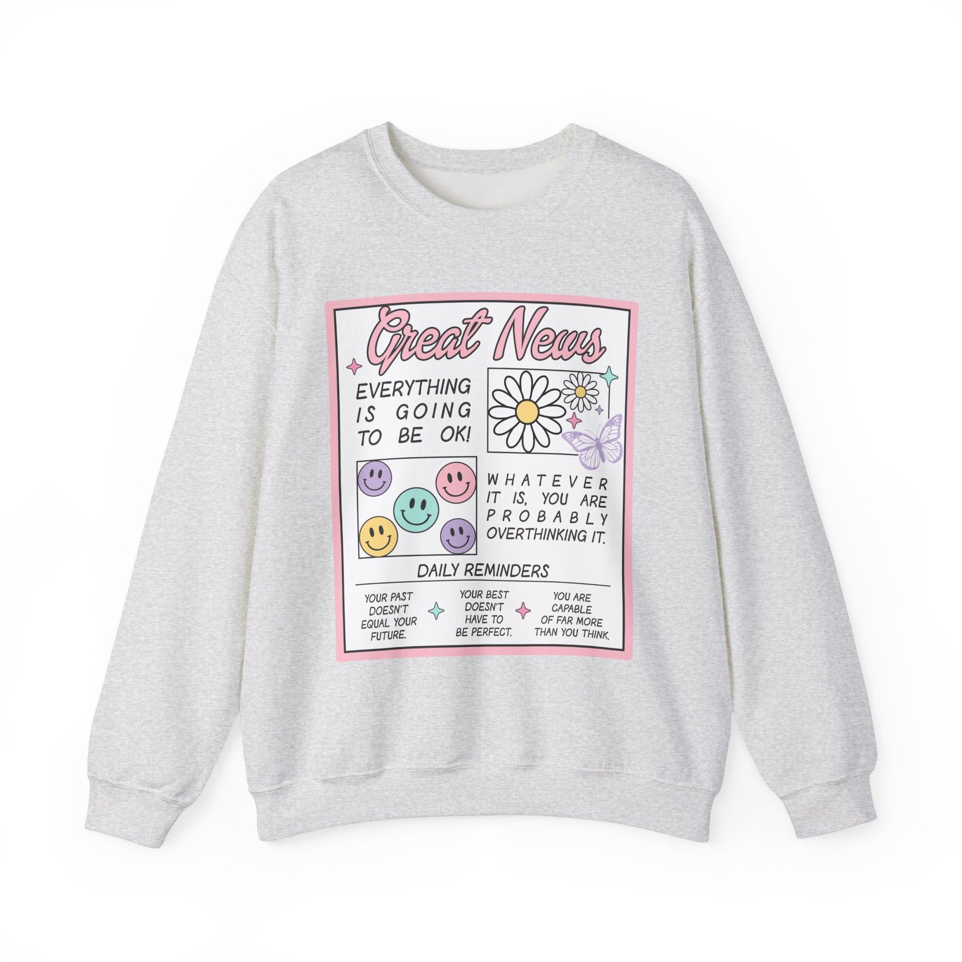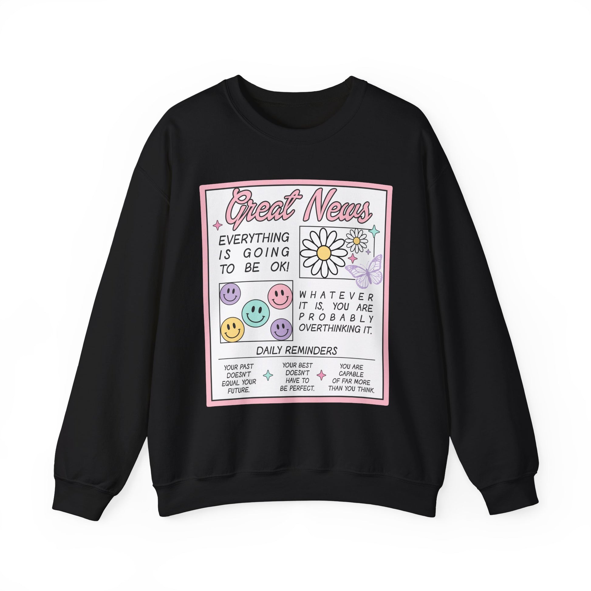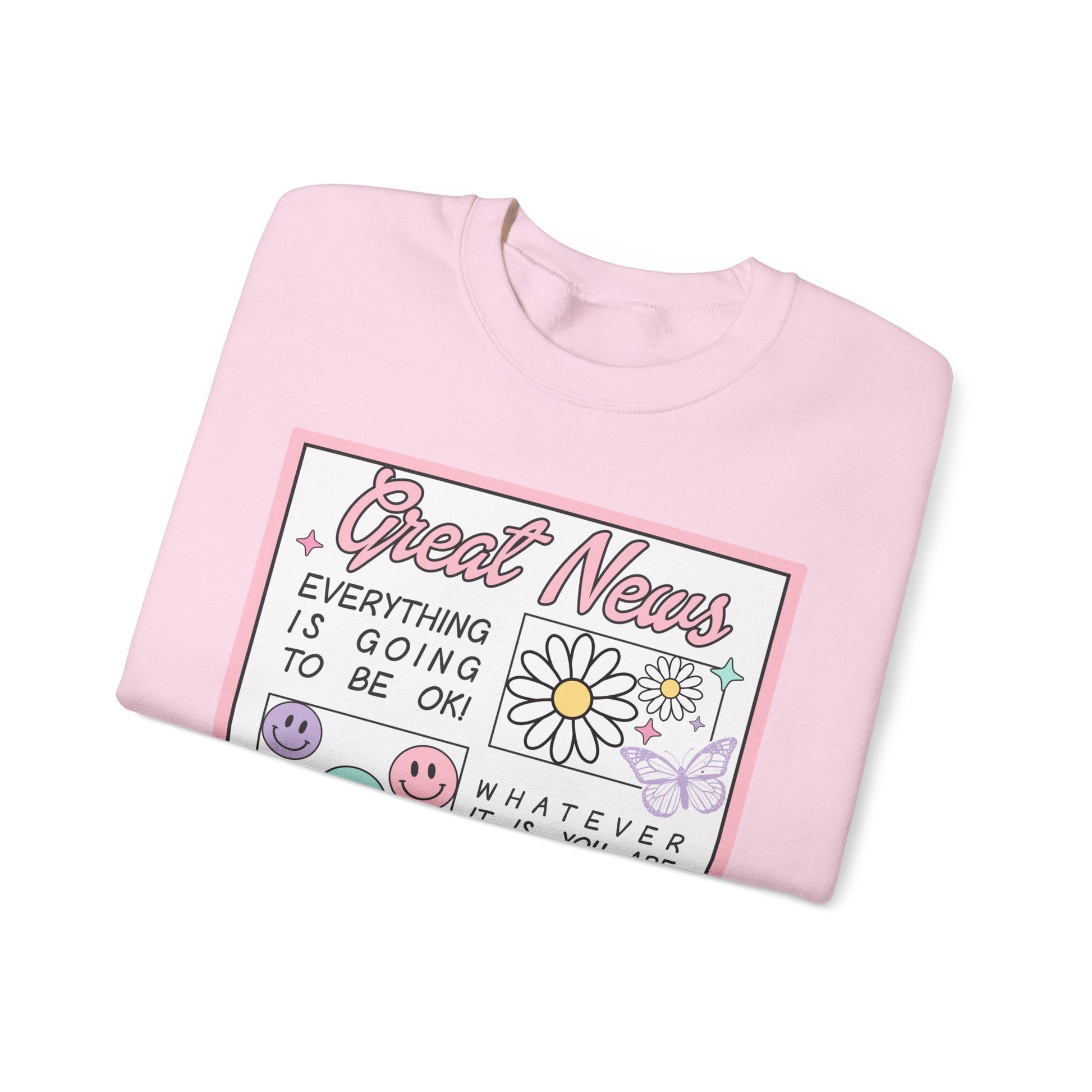 Stay cozy and stylish with this unisex heavy blend crewneck sweatshirt featuring a newspaper style graphic with the uplifting message 'GREAT NEWS, EVERYTHING WILL BE OKAY.' The preppy news design gives off a positive and cheerful vibe, perfect for those looking for a comforting and fashionable piece to add to their wardrobe. This sweatshirt is ideal for anyone who loves unique and motivational designs, making it a great choice for gifts for birthdays, holidays, or just to spread some positivity.
